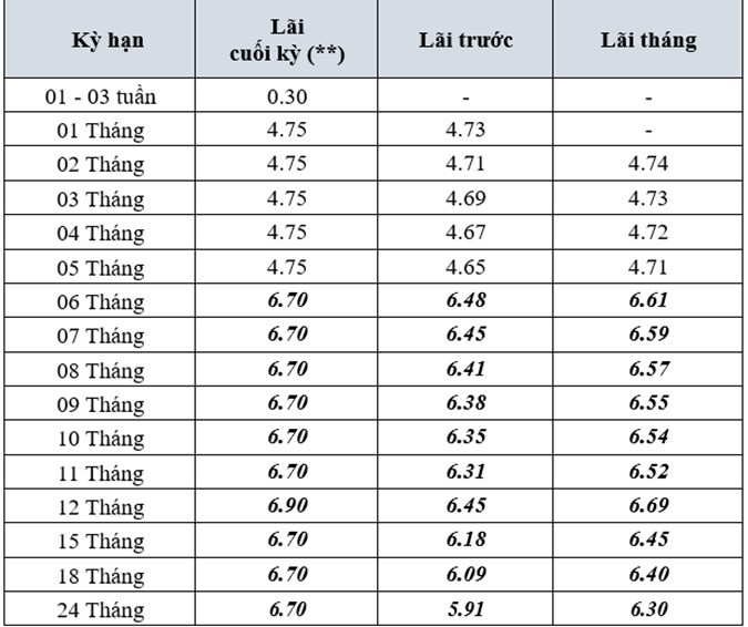 Tiếp theo là Techcombank. Tôi khá ấn tượng với cách họ điều chỉnh: giảm nhẹ 0,1% cho các kỳ hạn ngắn nhưng lại giảm cực mạnh tới 0,5%/năm cho các kỳ hạn dài từ 6 đến 36 tháng. Nếu bạn gửi trực tuyến, lãi suất kỳ hạn 12 tháng tại đây hiện chỉ còn 6,75%/năm. Tuy nhiên, tôi có một mẹo nhỏ cho bạn: Techcombank vẫn thường cộng thêm 0,8% lãi suất cho khoản tiền gửi mới vào mỗi thứ Hai hàng tuần, nên hãy chú ý thời điểm này nhé!
